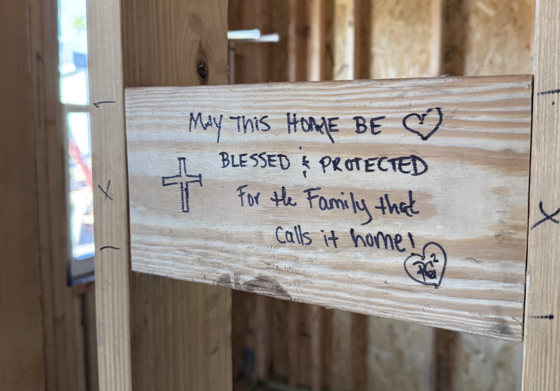 In a deeply personal moment, team members were invited to write handwritten notes and words of encouragement directly onto the stud walls of one of the homes before drywall installation—messages that will remain permanently embedded within the structure.